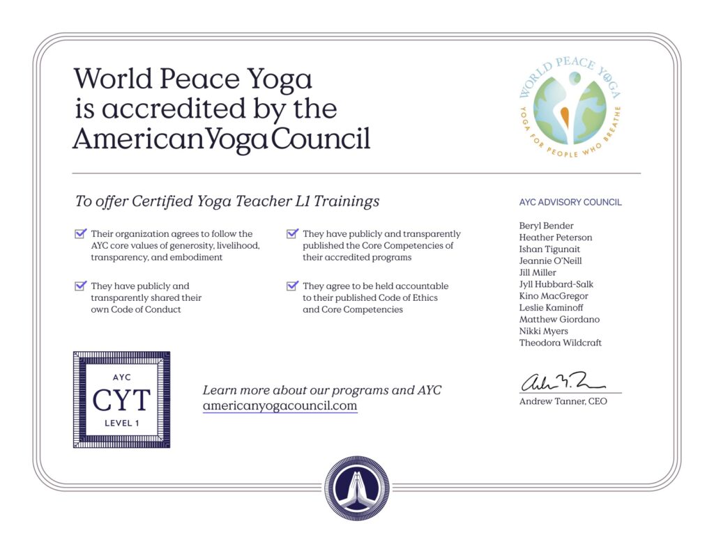 Please note that no refunds are issued for this course. For more information on payment plans and scholarships, please email us at yoga@worldpeaceyoga.com.