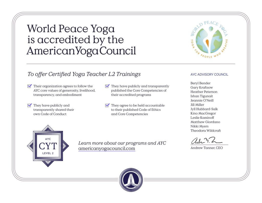 You receive a 300-hour Advanced certificate from World Peace Yoga for completing Part II, Go Deeper, an accredited program with the American Yoga Council, AYC. And you may refer to yourself as a “300-hour CYT” for 300-hour Certified Yoga Teacher or a “600-hour CYT” if you completed our for completing Part I, Get Rooted program.